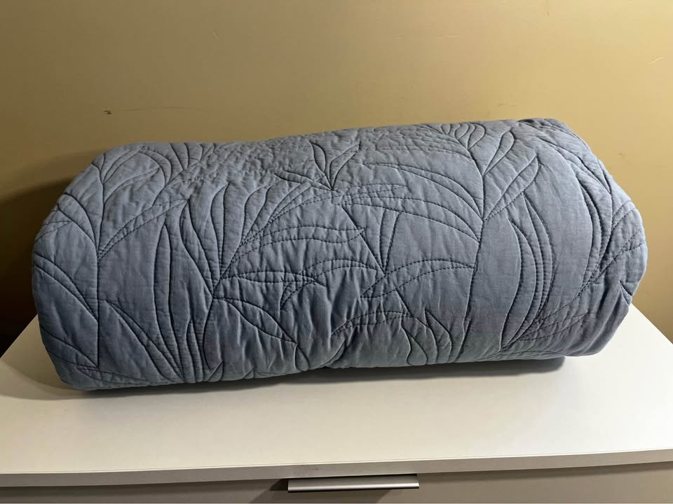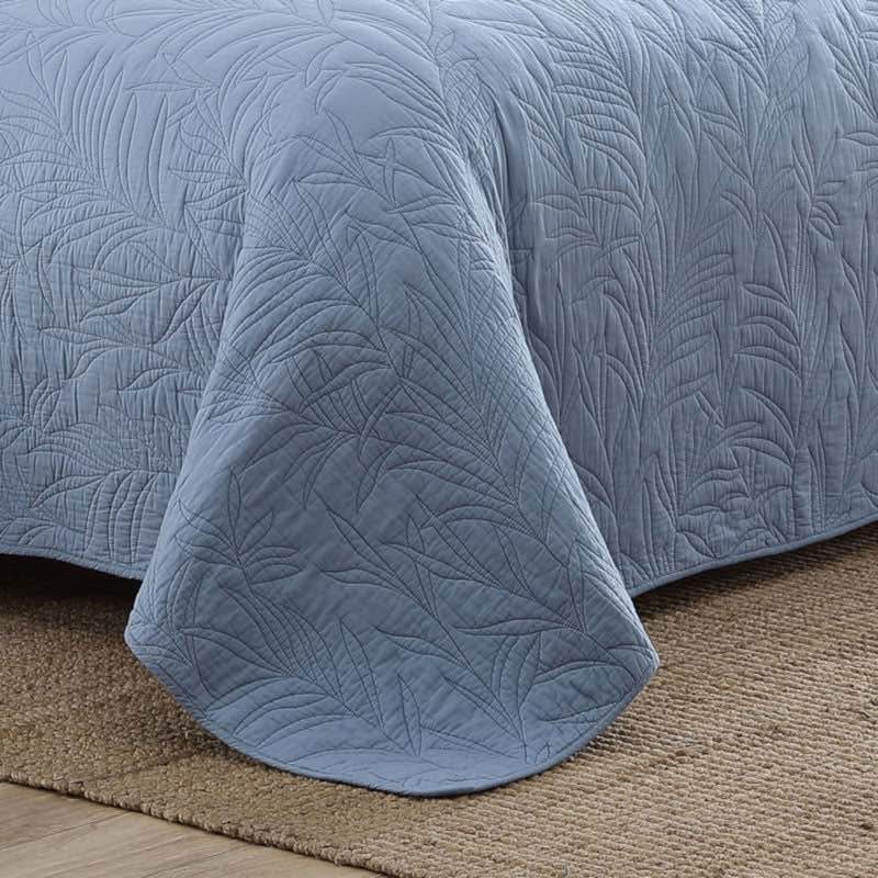 Bring a relaxed coastal vibe to your bedroom with the Costa Sera Stitch Quilt by Tommy Bahama. Featuring an elegant leaf-stitched pattern on a solid blue backdrop, this quilt adds subtle texture and sophistication to any space. Prewashed for extra softness, it offers a cozy yet lightweight layer that's perfect for year-round use—whether styled on its own or layered with your existing bedding. Made from 100% cotton with a polyester fill, this quilt is also reversible for versatile styling options.